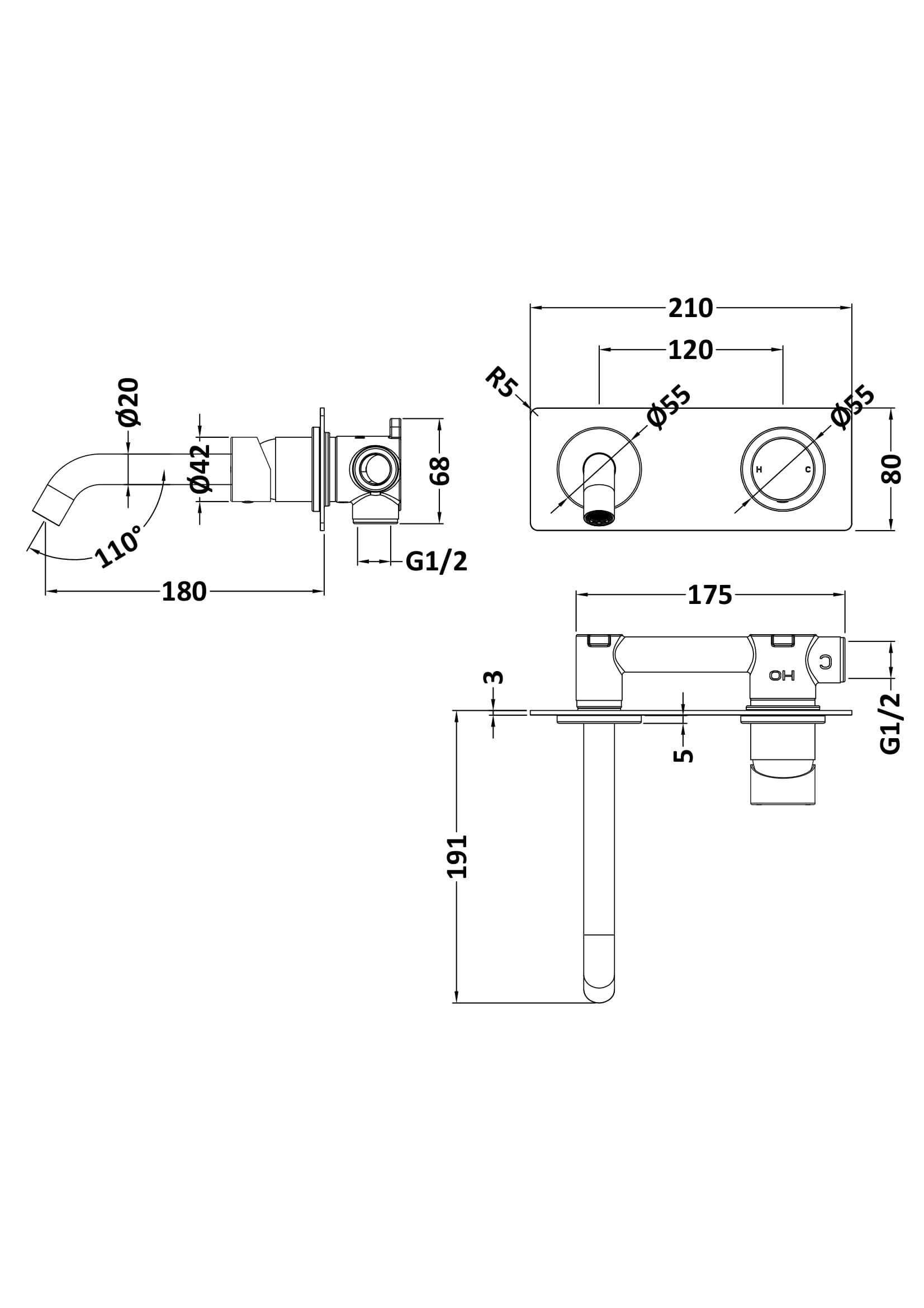 Windon Wall Mounted 3 Tap Hole Basin Mixer