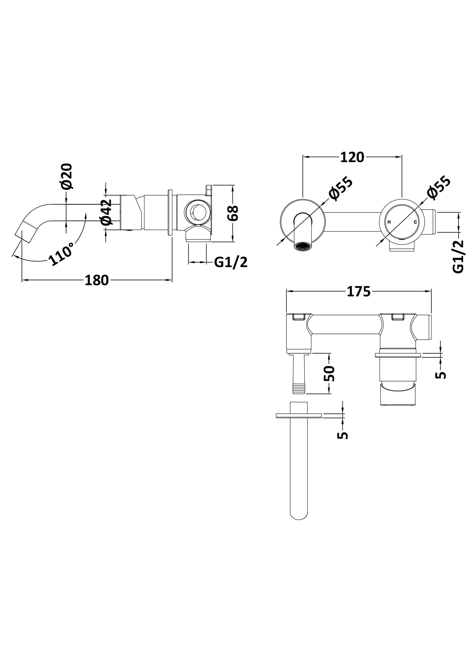 Windon Wall Mounted 2 Tap Hole Basin Mixer