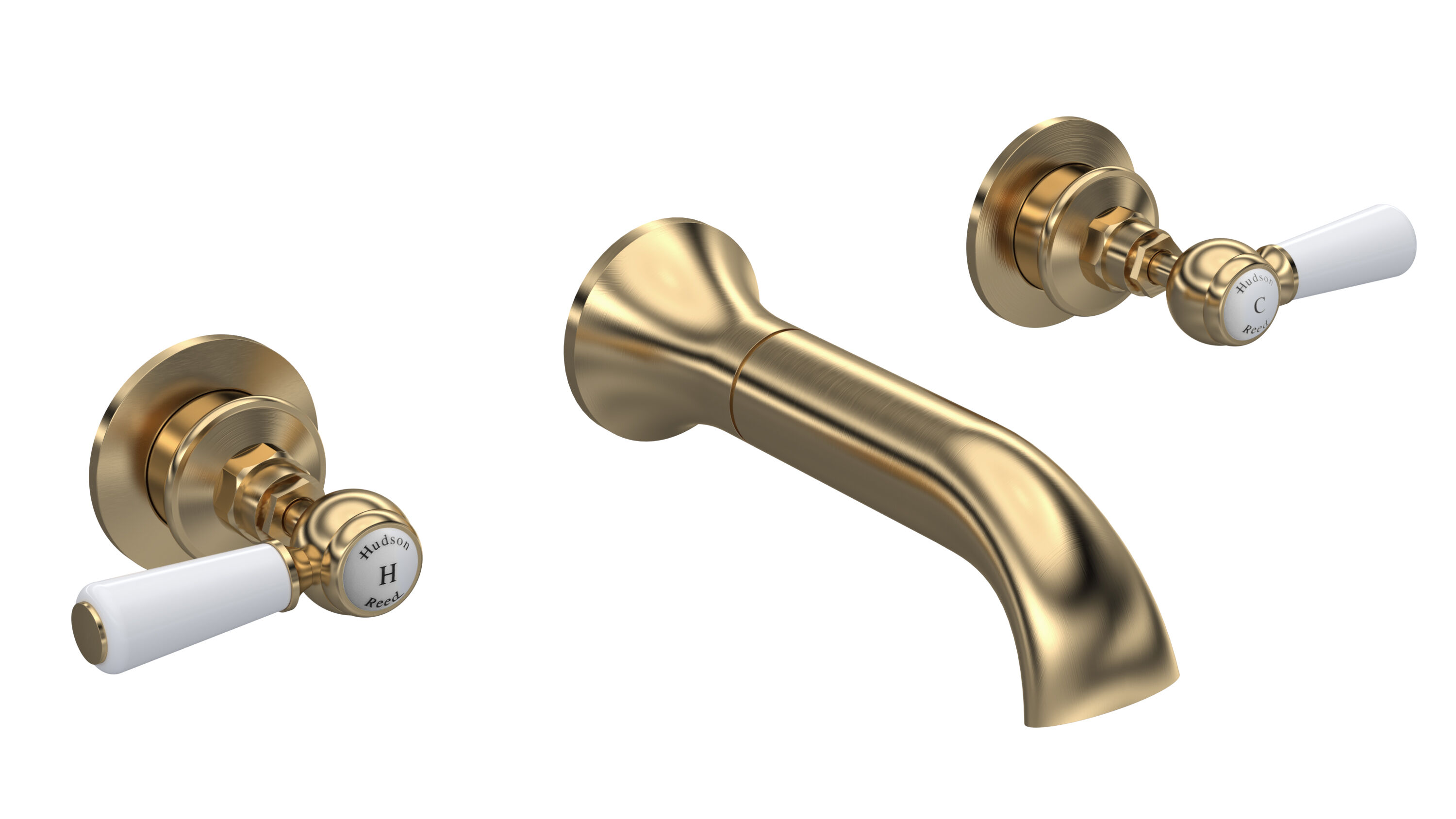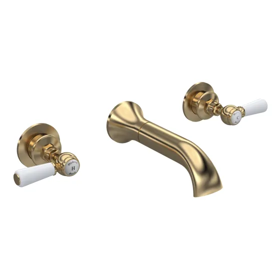 Old London White Topaz With Lever Handle Wall Mounted Bath Spout & Stop Taps - Brushed Brass / White