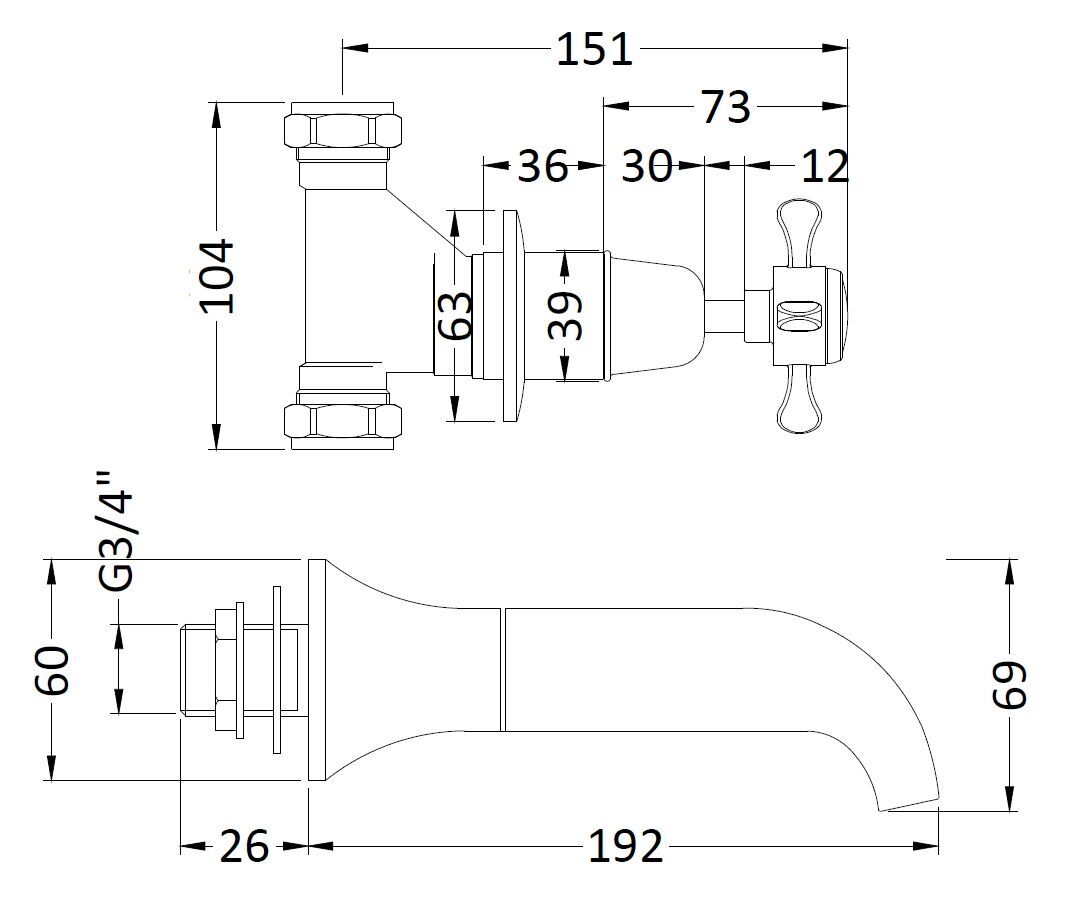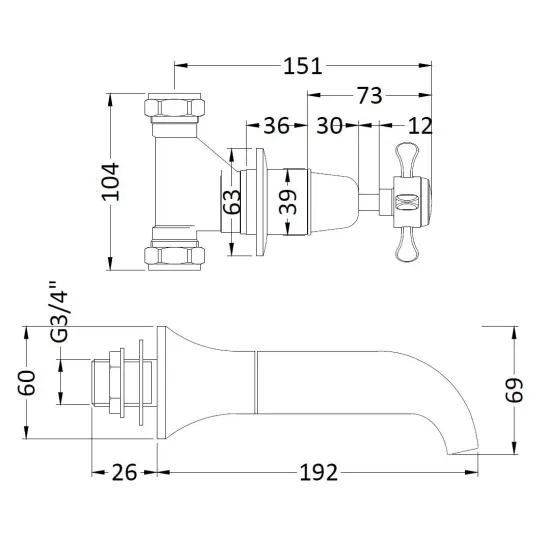Old London White Topaz With Crosshead Handle Wall Mounted Bath Spout & Stop Taps - Chrome / White