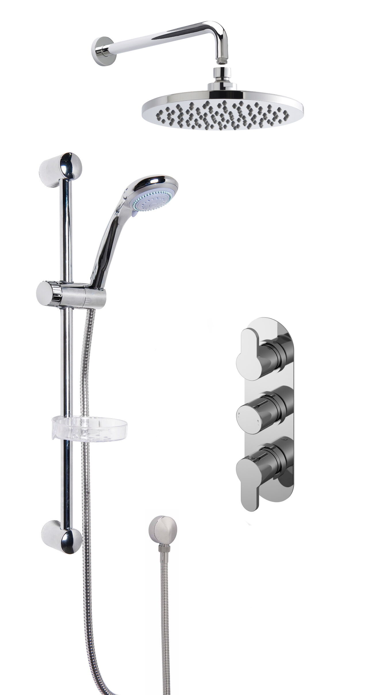 • Double outlet systems provide great flexibility combining both a fixed head and handset. This pack includes valve, fixed head, arm, shower kit and elbow.