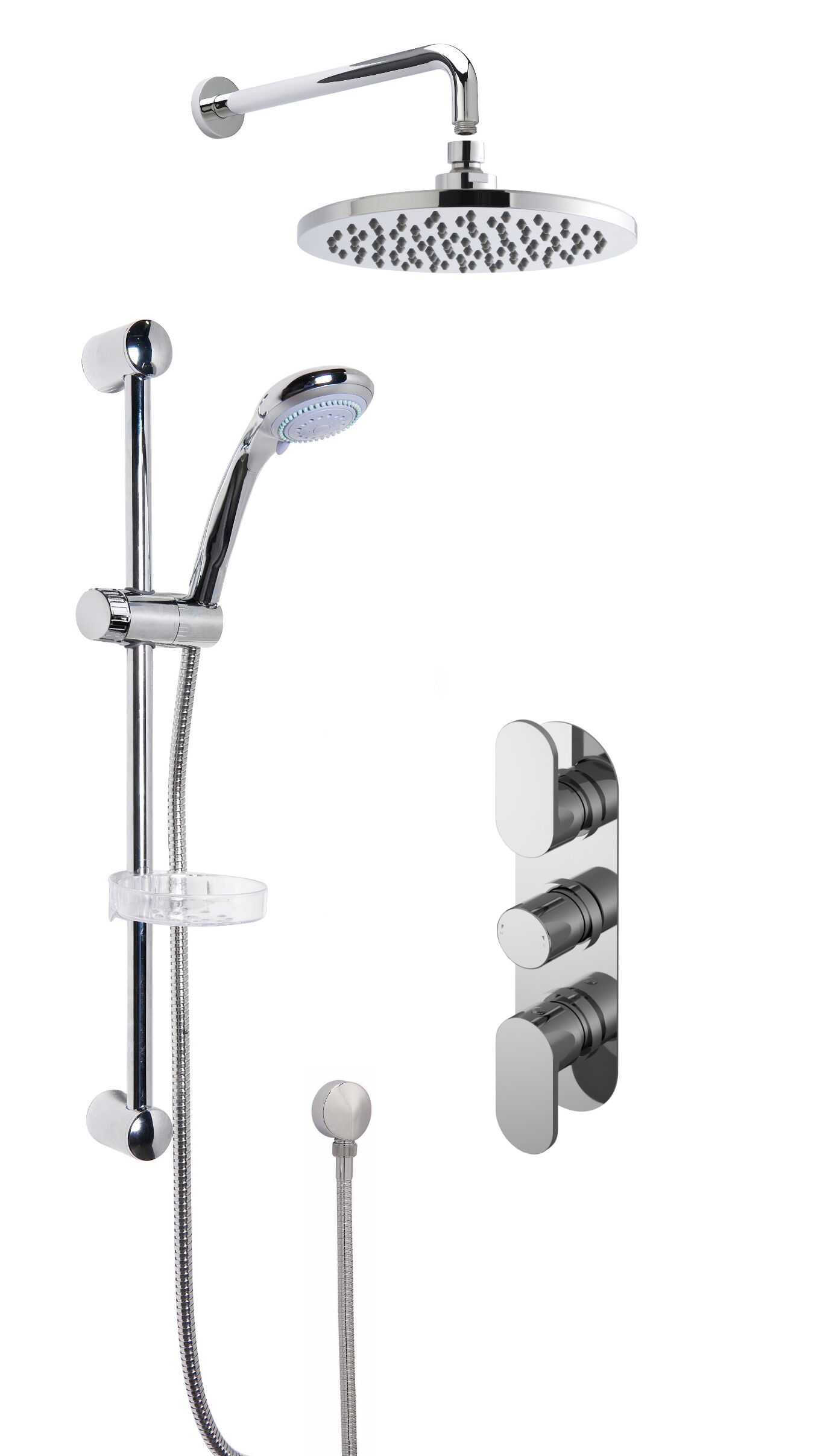 • Double outlet systems provide great flexibility combining both a fixed head and handset. This pack includes valve, fixed head, arm, shower kit and elbow.