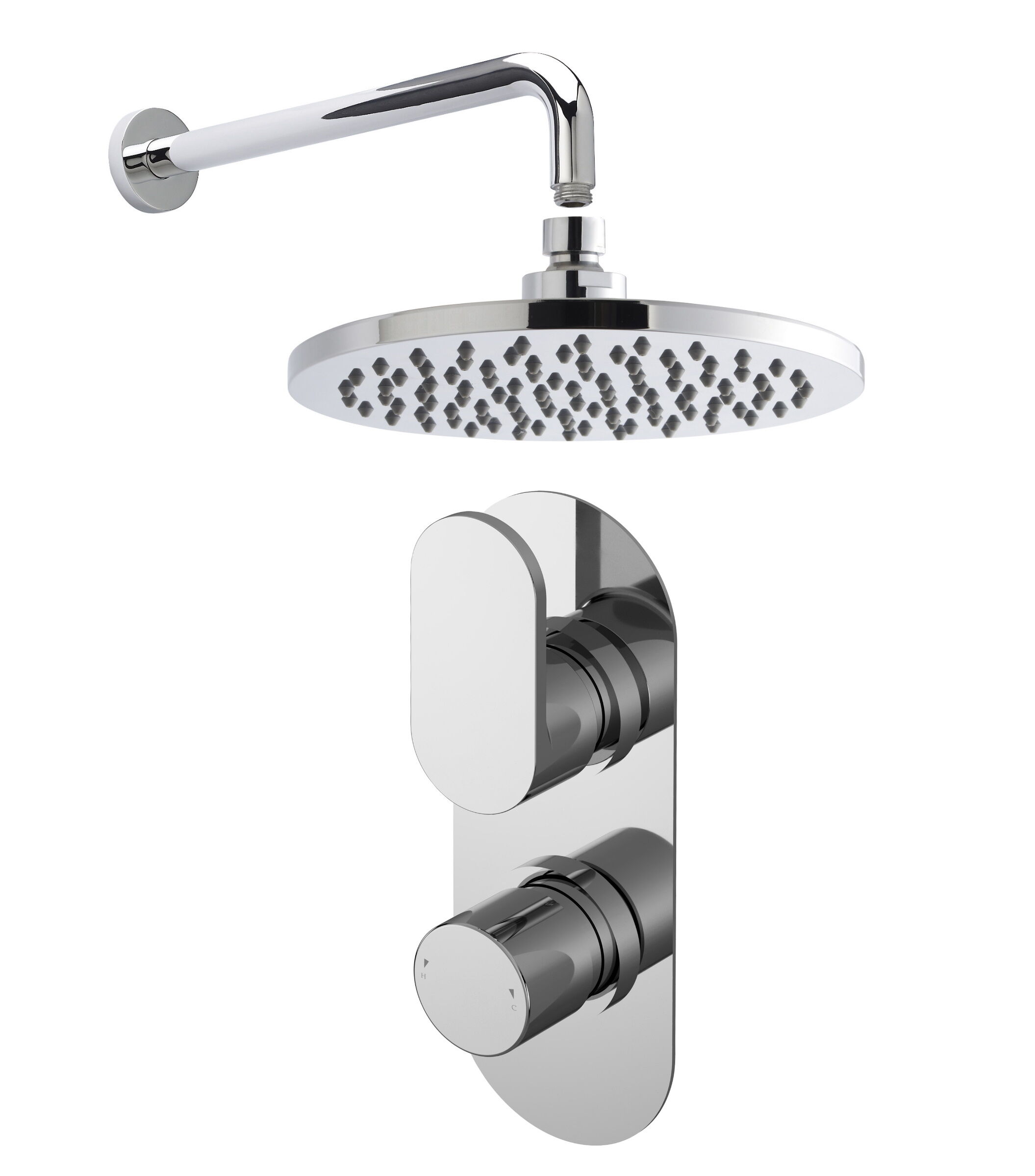 nuie Binsey Thermostatic Concealed Twin Round Valve, Wall Mount Shower Arm & Round Fixed Head Shower Kit - Chrome