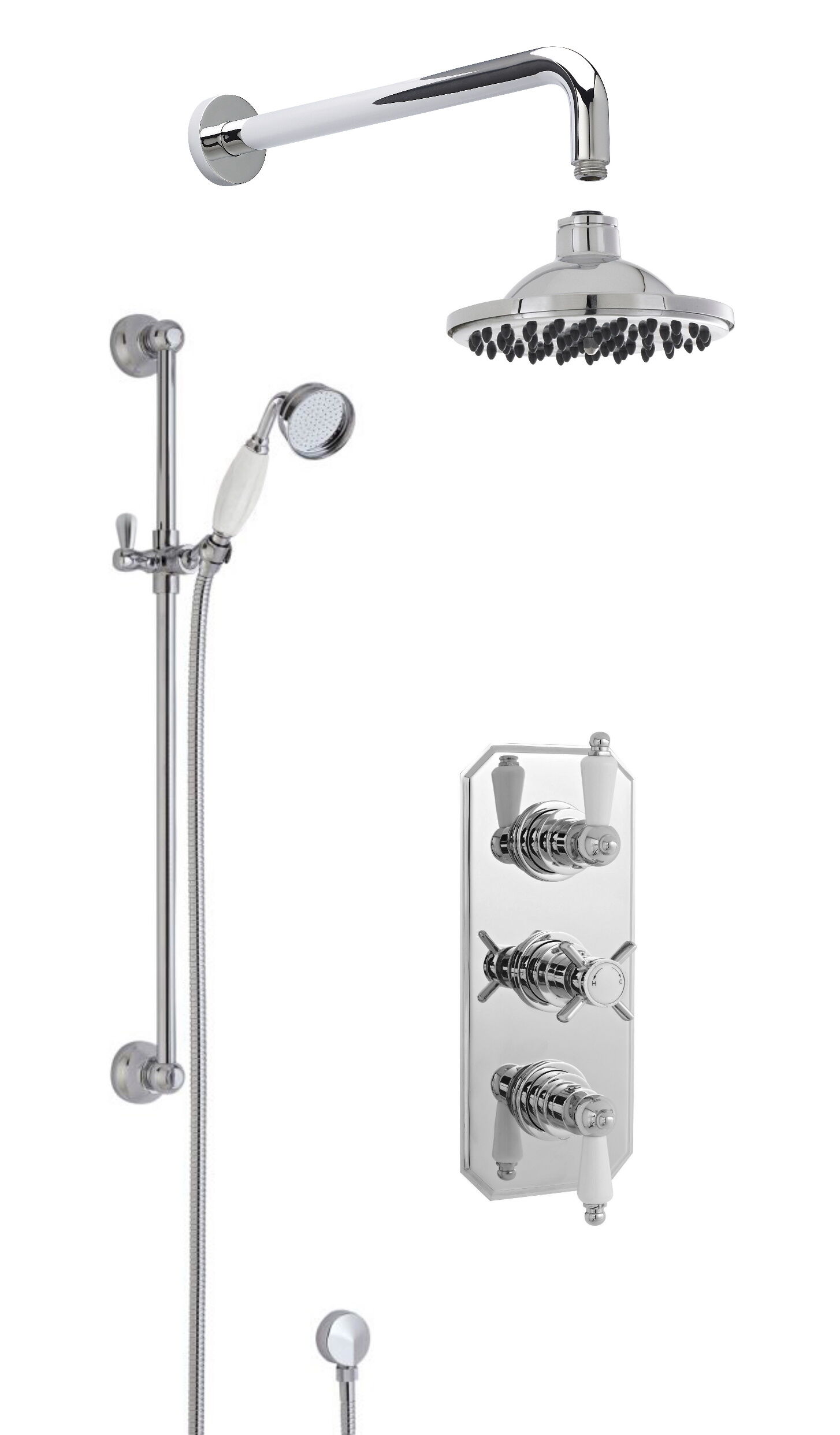 nuie Edwardian Traditional Thermostatic Concealed Triple Valve, Single Function Slider Rail Kit & Outlet Elbow & Wall Mount Shower Arm and Round Fixed Head Shower Kit - Chrome/White
