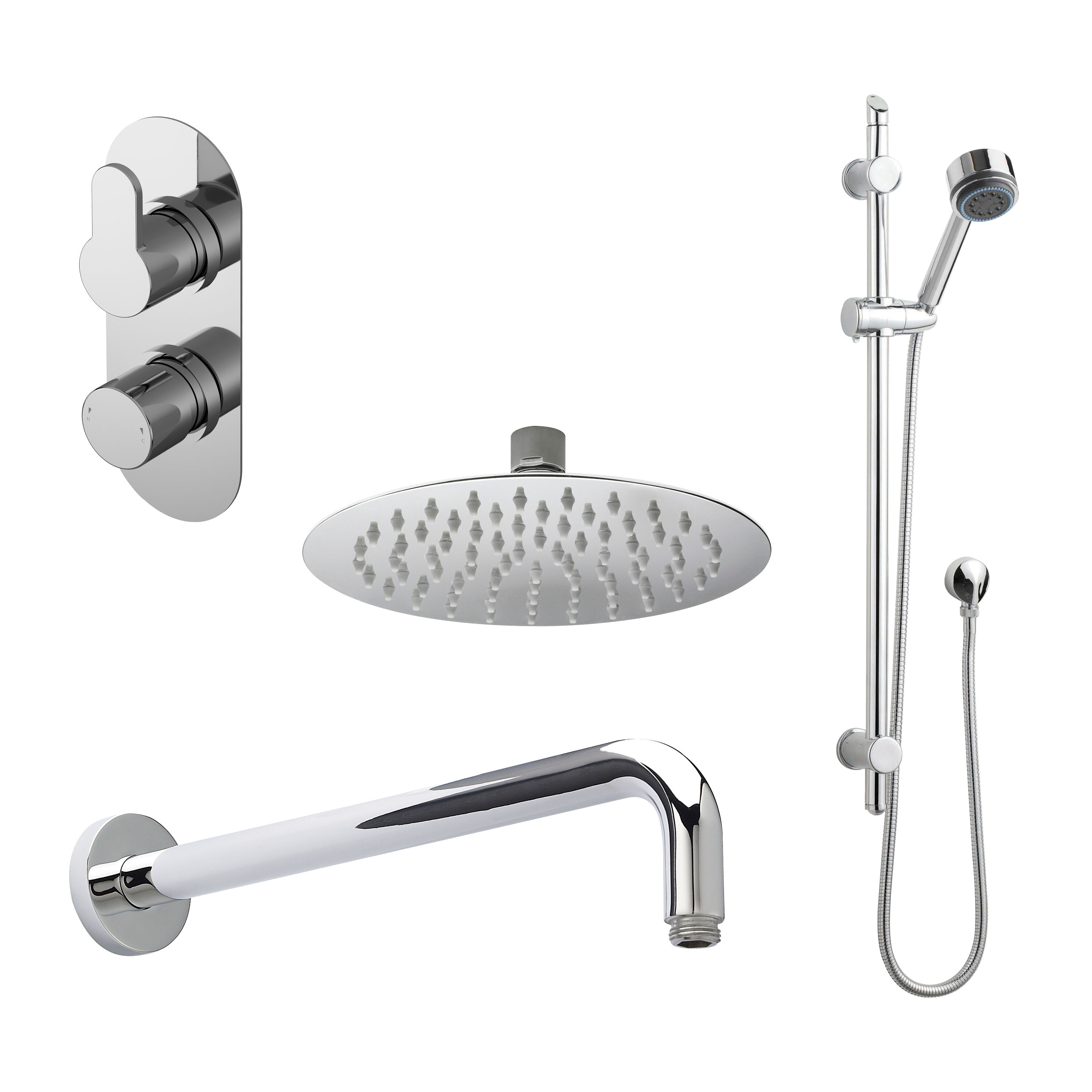 nuie Arvan Chrome Twin Thermostatic Valve With Diverter, Shower Wall-Mounted Arm, Fixed Shower Head and Slider Rail Kit