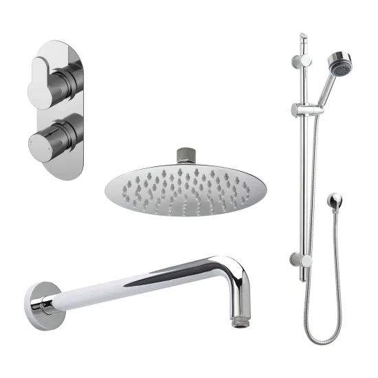 Nuie Arvan Twin Thermostatic Valve with Diverter, Shower Arm, Fixed Shower Head and Slider Rail Kit