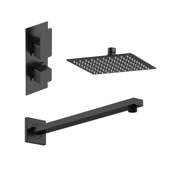 Nuie Windon Matt Black Twin Thermostatic Valve, Square Wall-Mounted Shower Arm and Fixed Head