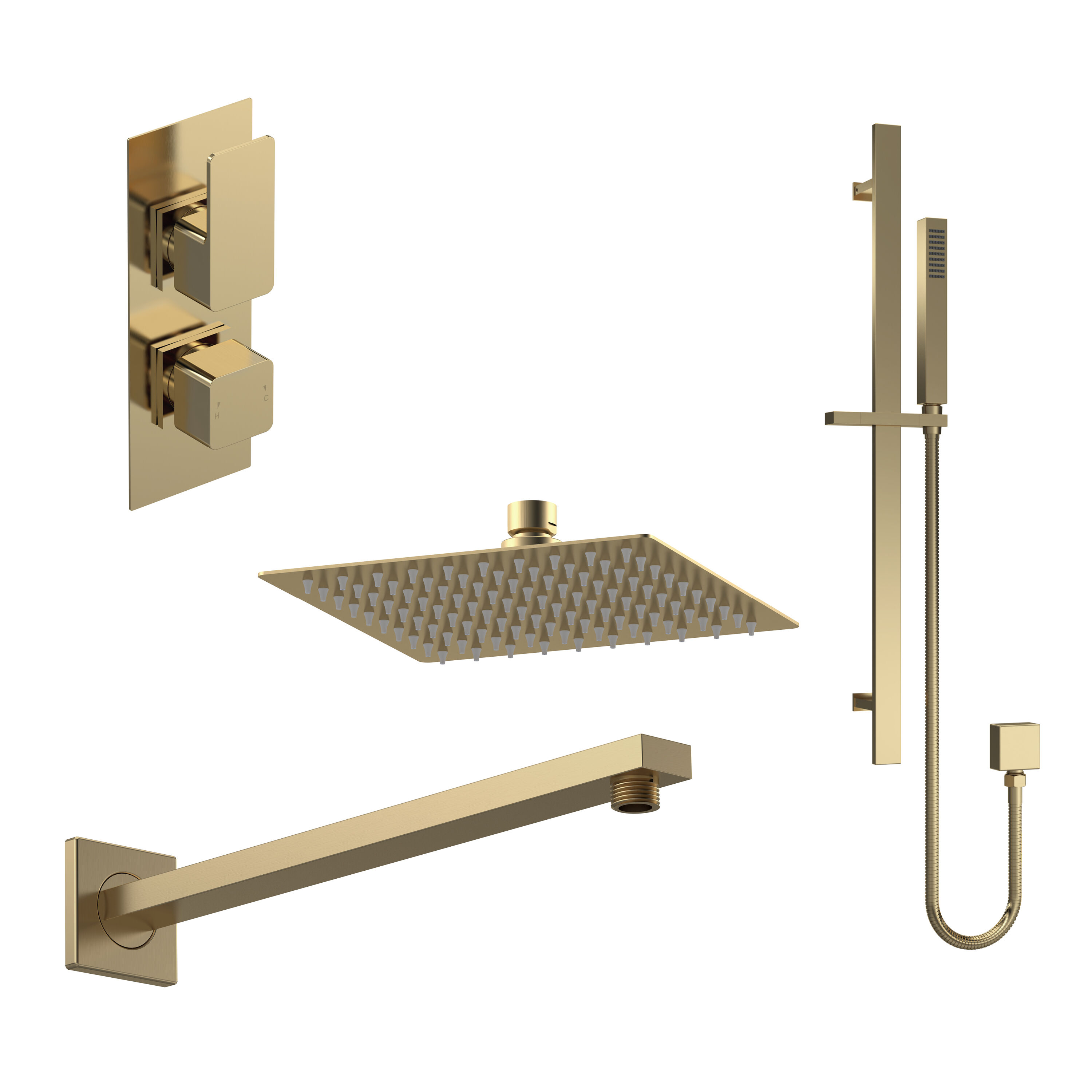 nuie Windon Brushed Brass Twin Thermostatic Valve With Diverter, Shower Wall-Mounted Arm, Fixed Shower Head and Slider Rail Kit