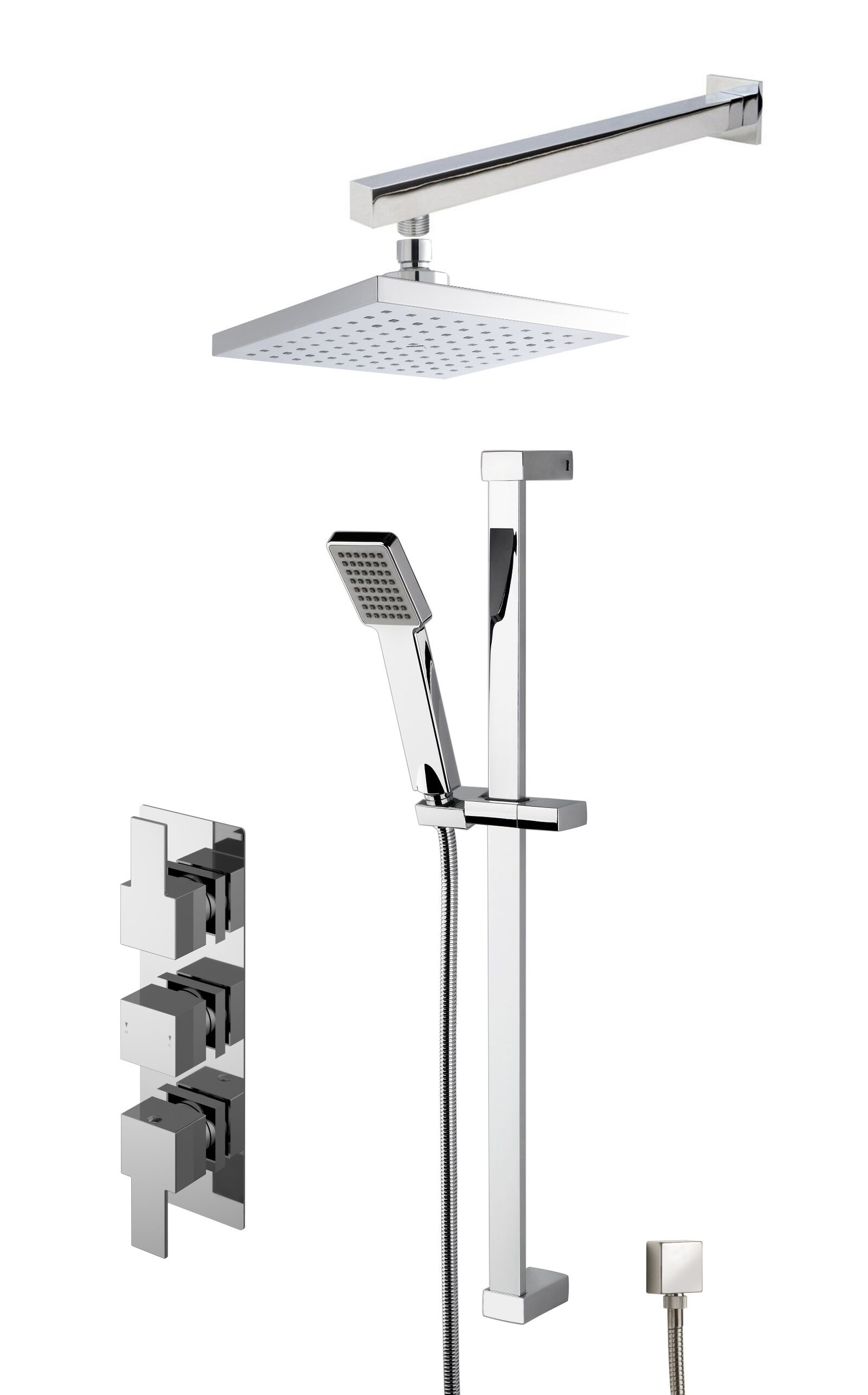 nuie Sanford Thermostatic Concealed Triple Square Valve with Single Function Handset & Outlet Elbow Wall Mount Shower Arm & Square Fixed Head Shower Kit - Chrome