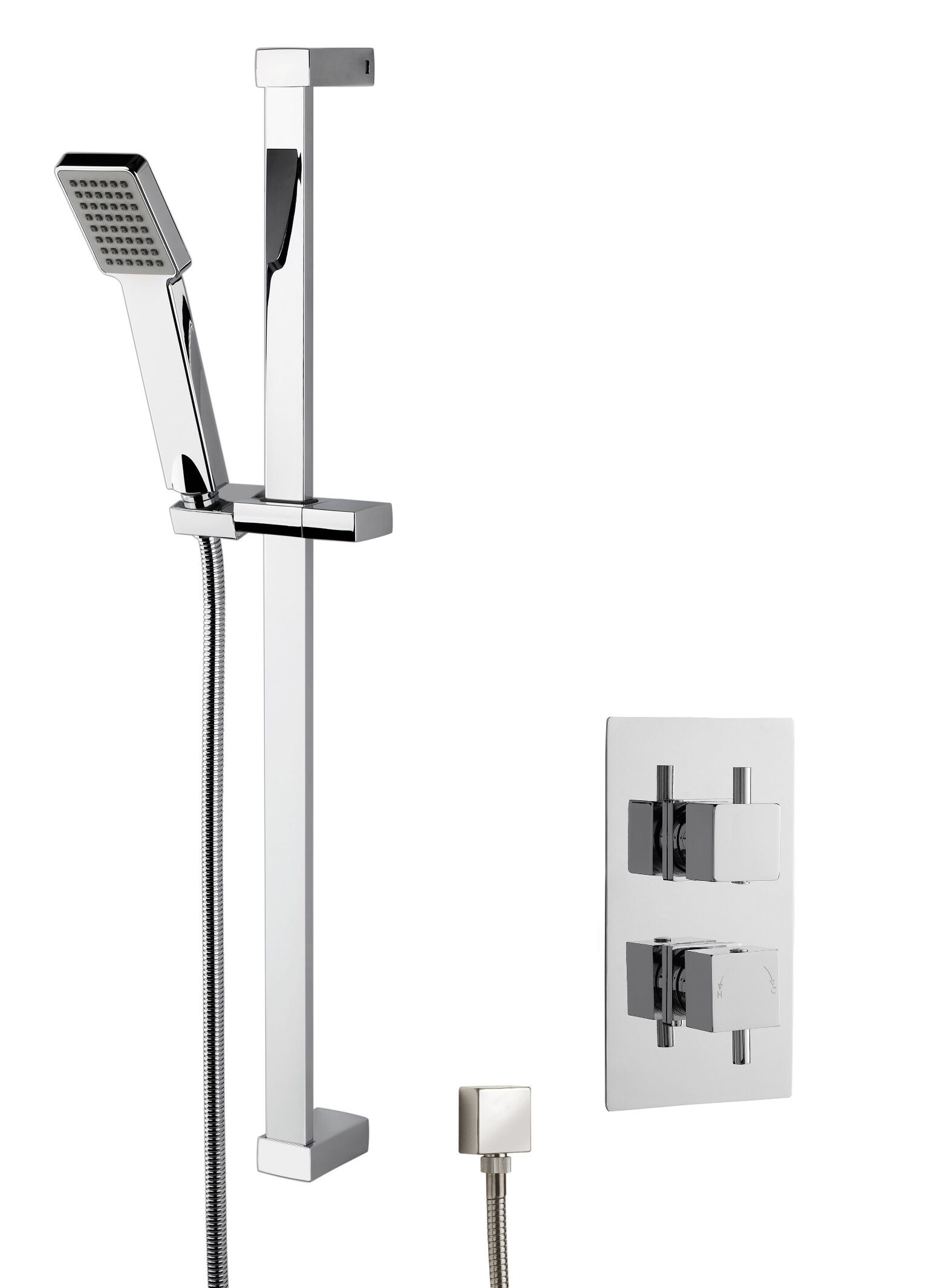 nuie Thermostatic Concealed Twin Square Valve & Slide Rail Kit with Single Function Handset & Outlet Elbow Shower Kit - Chrome