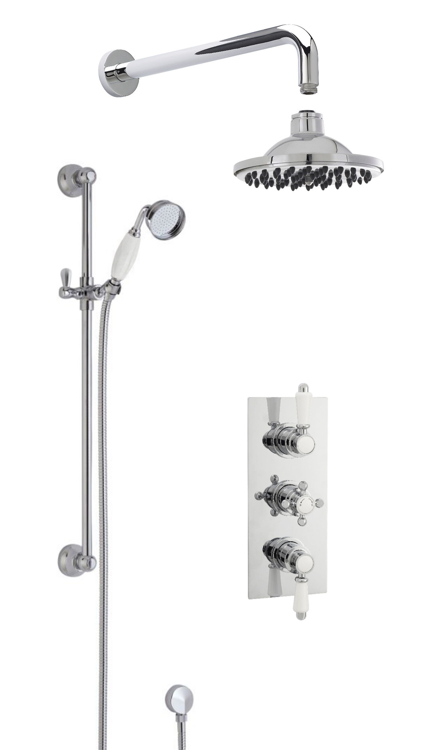 nuie Victorian Traditional Thermostatic Concealed Triple Valve, Single Function Slider Rail Kit & Outlet Elbow & Wall Mount Shower Arm and Round Fixed Head Shower Kit - Chrome/White